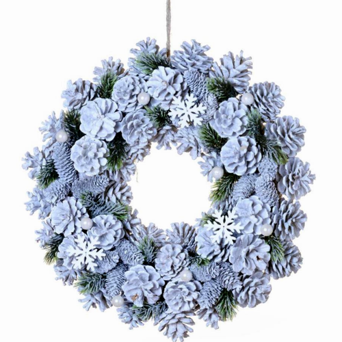 Der Kranz ist mit Tannenzweigen, Perlen und Zapfen verziert und hat einen frostigen Look. Mit einem Durchmesser von ca. 35 cm ist er ein echter Blickfang an jeder Tür oder Wand.