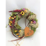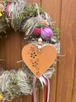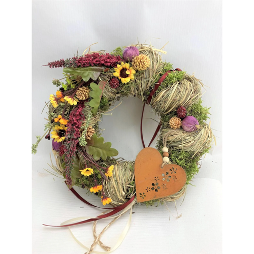 Er besteht aus einem Waldgesteck aus Naturmaterial und einem Blumengesteck aus Kunstmaterial. Mit einem Durchmesser von ca. 28 cm und einem rostigen Herz in der Mitte ist er ein echter Blickfang. Der Tür Kranz schmückt nicht nur Ihre Tür, sondern verleiht auch Ihrem Eingangsbereich eine gemütliche Atmosphäre.